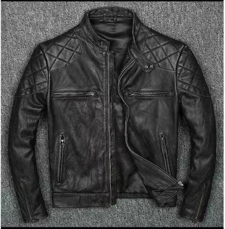 3. Detailed Quilted Design: Kandhon (shoulders) aur kohniyon (elbows) par di gayi diamond-quilted stitching isse aik authentic cafe racer motorcycle vibe deti hai.
