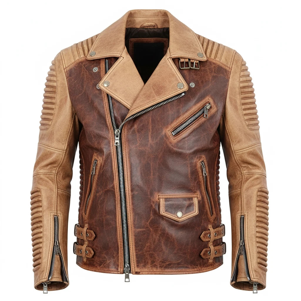 Men’s Slim Fit Vintage Biker Jacket – Premium Distressed Brown Real Leather