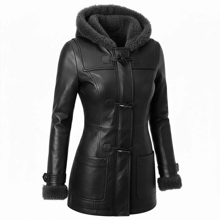 Women’s Black Genuine Sheepskin Leather Hooded Coat – Winter Warm Toggle Jacket