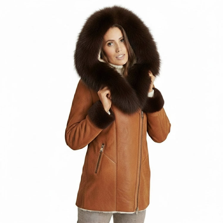 Women’s Brown Sheepskin Shearling Coat – Hooded Faux Fur Leather Winter Jacket